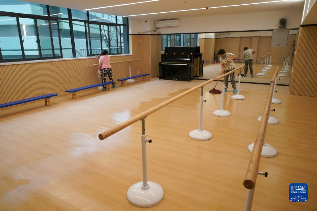 8月25日,在新建成的西安市雁塔區第一小學(xué)的一間舞蹈教室內,保潔人員在打掃衛生。