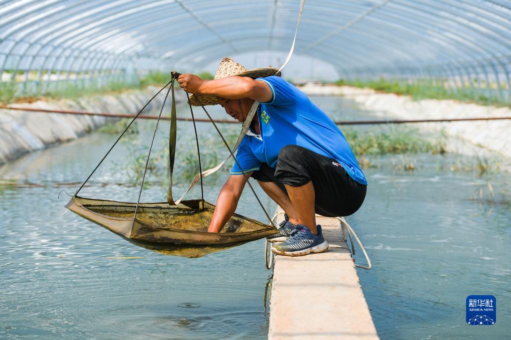 8月25日,鹽堿水對蝦養殖園區工作人員查看對蝦生長(cháng)情況。