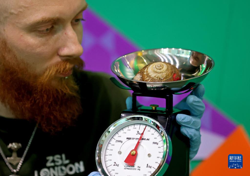 8月25日,在英國倫敦動(dòng)物園,工作人員為一只蝸牛稱(chēng)重。