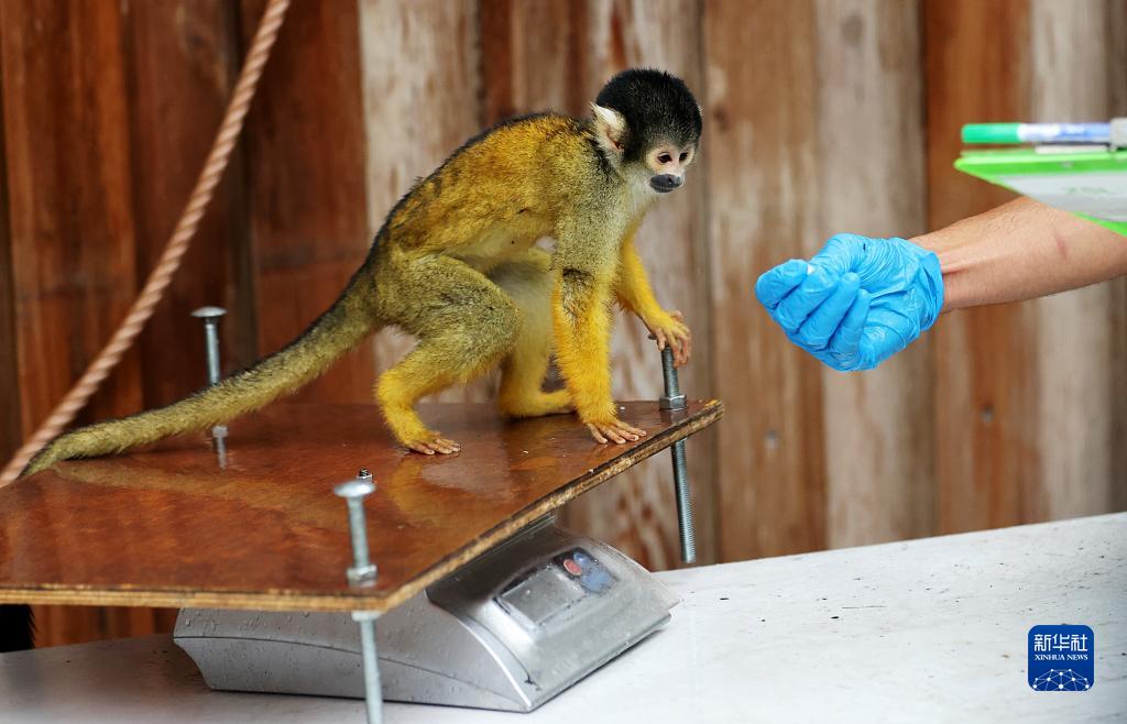 8月25日,在英國倫敦動(dòng)物園,工作人員為一只松鼠猴稱(chēng)重。