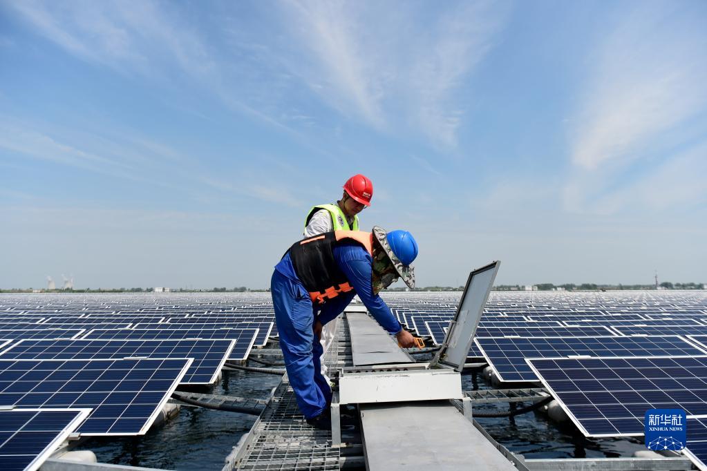 8月25日,運維人員在潁上縣毛圩水上光伏電站進(jìn)行巡檢。