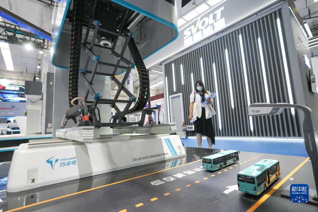 8月26日,一位參觀(guān)者在參觀(guān)一款面向無(wú)人駕駛自動(dòng)客車(chē)的柔性充電弓。