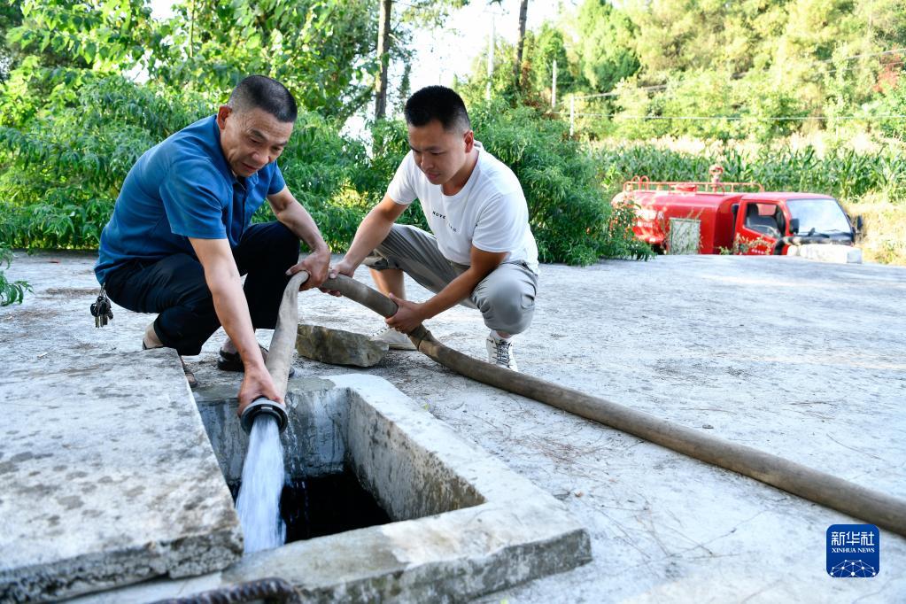 8月23日,在遵義市桐梓縣燎原鎮山層村,鄉鎮專(zhuān)職消防員(右)和村民在給村里的蓄水池補充生活用水。