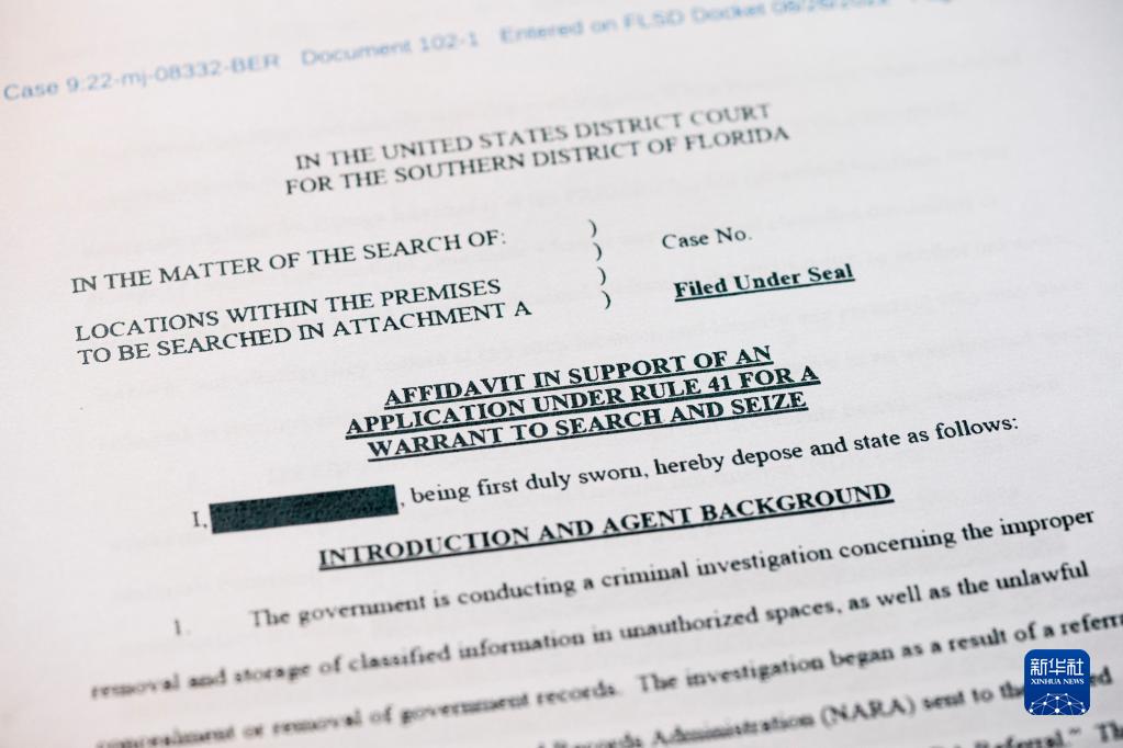 這是8月26日拍攝的美國聯(lián)邦調查局申請搜查前總統特朗普住所海湖莊園時(shí)向法院提交書(shū)面證詞的部分內容。