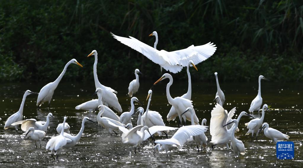8月27日,白鷺在山東省滕州市的荊河上嬉戲。