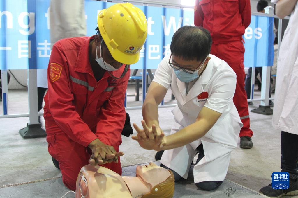 8月26日,在津巴布韋旺吉電站,醫療隊隊員向中企當地員工教授現場(chǎng)緊急救助技巧。