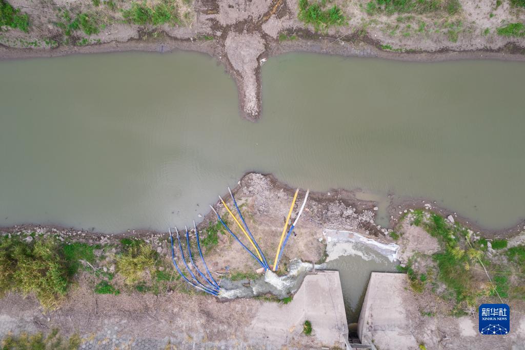 這是8月25日在湖南省常德市安鄉縣三岔河鎮拍攝的一處提水作業(yè)點(diǎn)(無(wú)人機照片)。