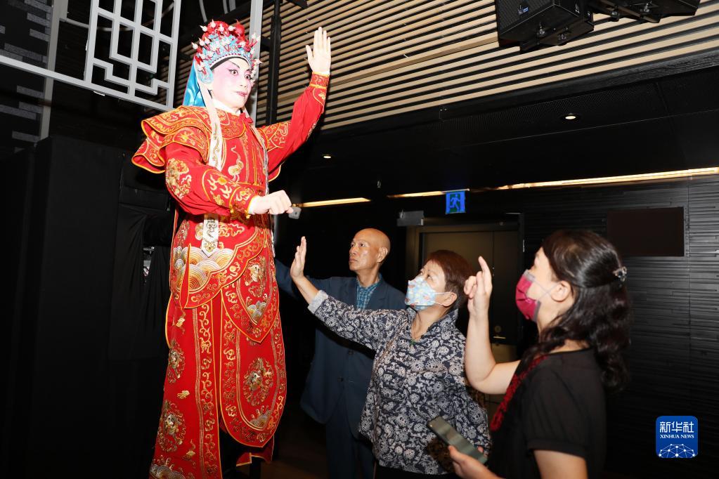 8月22日,創(chuàng )新粵劇《開(kāi)心穿粵》的兩位導演羅家英(左)和鐘珍珍(中)向記者介紹機器人。