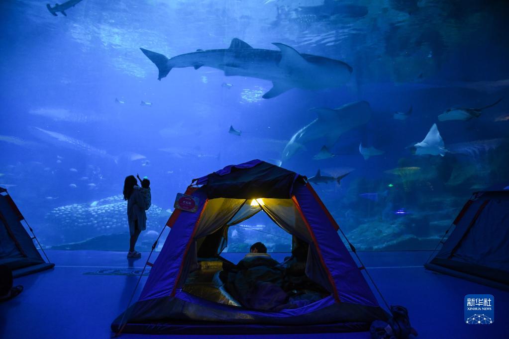 8月27日,體驗者在珠海長(cháng)隆海洋王國鯨鯊館搭帳篷夜宿,在鯨鯊保育專(zhuān)家的科普中增長(cháng)知識,近距離體驗與鯨鯊等海洋生物同眠的奇妙之夜,感受人與自然和諧相處,傳遞生態(tài)保護理念。