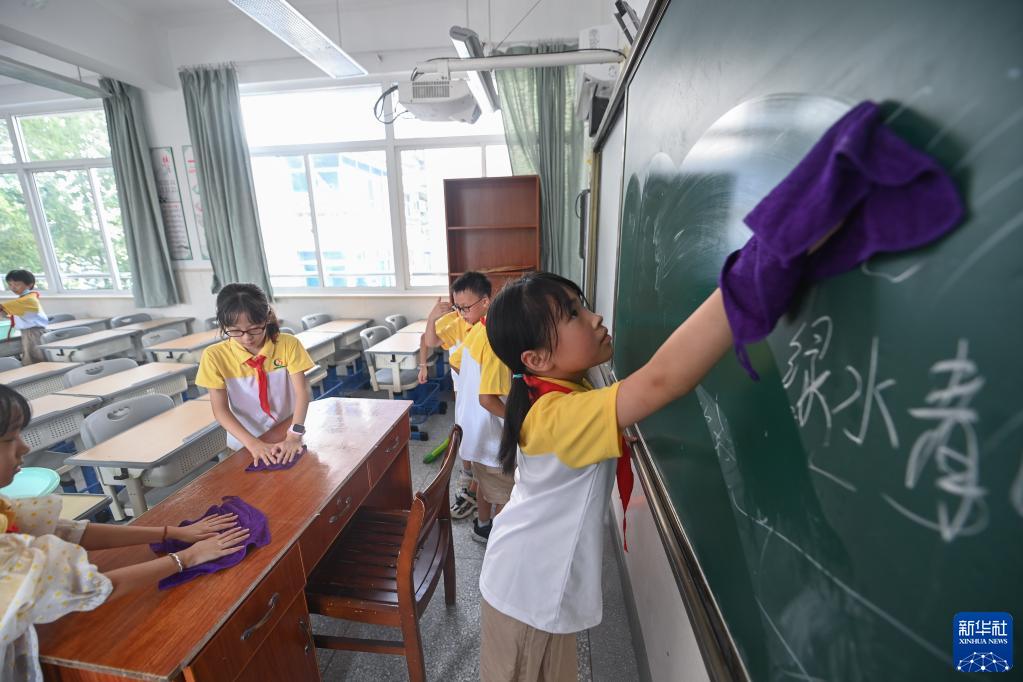 8月29日,龍泉小學(xué)的學(xué)生在打掃教室,開(kāi)啟新學(xué)期“開(kāi)學(xué)第一課”。