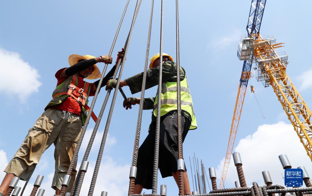 8月29日,工人在臨港西島金融中心項目工地上進(jìn)行塔樓剪力墻鋼筋綁扎作業(yè)。