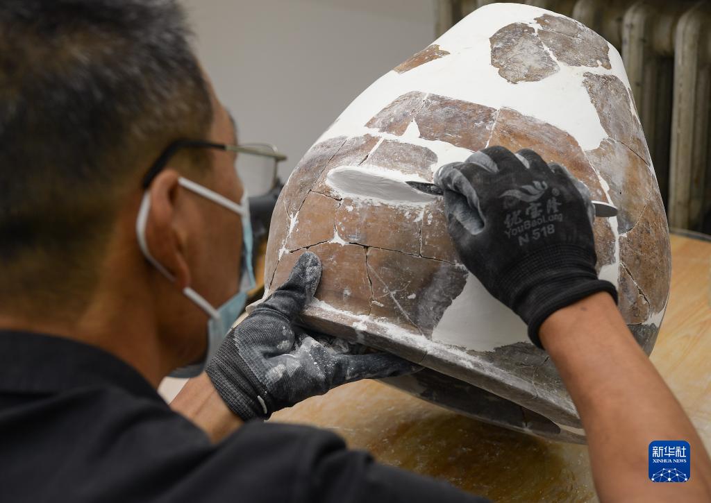 文物工作者對南佐遺址內出土的陶器進(jìn)行修復(8月25日攝)。