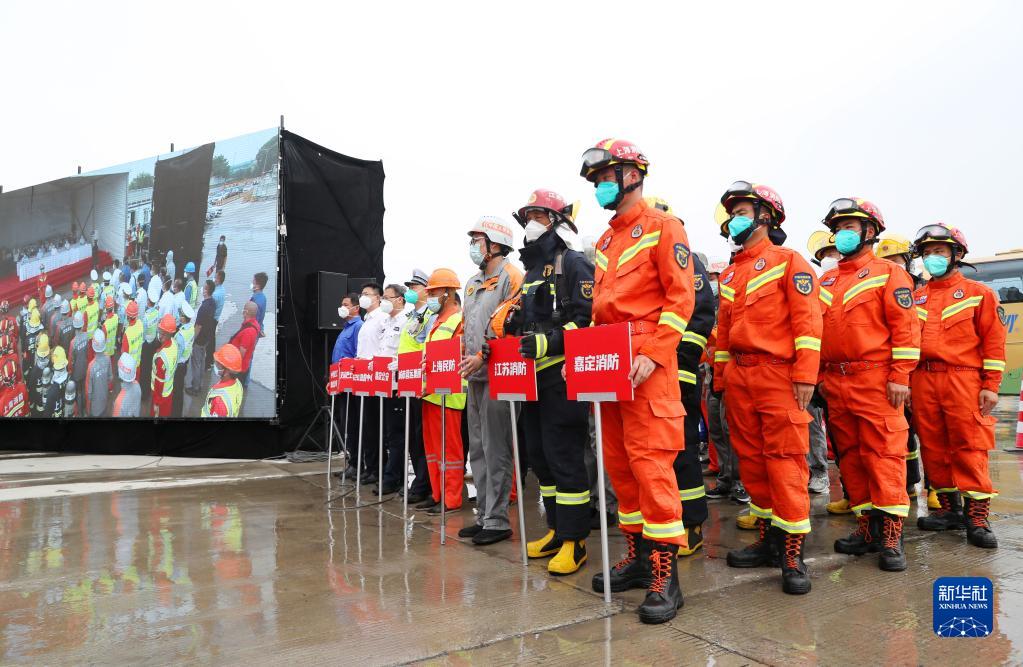 當日,2022年長(cháng)三角跨區域交通保障應急處置綜合演練在上海G15沈海高速朱橋收費站區域舉行。