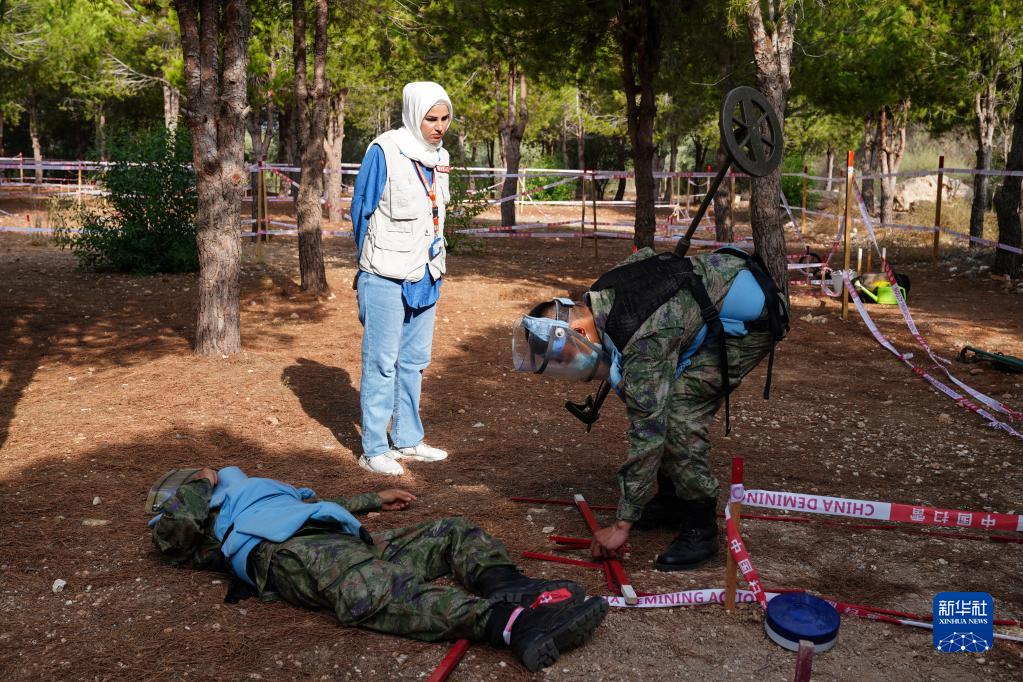 8月30日,在黎巴嫩南部辛尼亞村掃雷訓練場(chǎng),雷場(chǎng)救援考核中官兵開(kāi)辟救援通道。