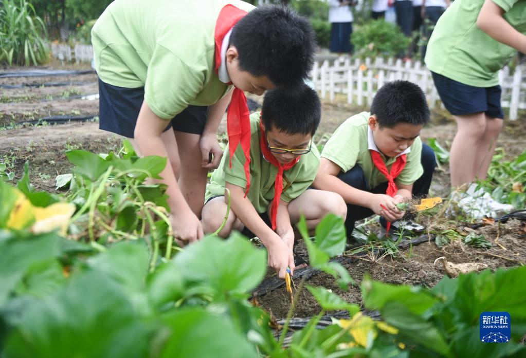 當日,在浙江省嘉興市南湖區新豐鎮中心小學(xué)的校園農場(chǎng)內,學(xué)生們參加收番薯、除草、澆水等特色勞動(dòng)課程,開(kāi)啟新學(xué)期的“開(kāi)學(xué)第一課”。新豐鎮中心小學(xué)是浙江省拓寬校外勞動(dòng)實(shí)踐途徑試點(diǎn)學(xué)校,依托校園農場(chǎng)形成了特色鮮明的勞動(dòng)課程。