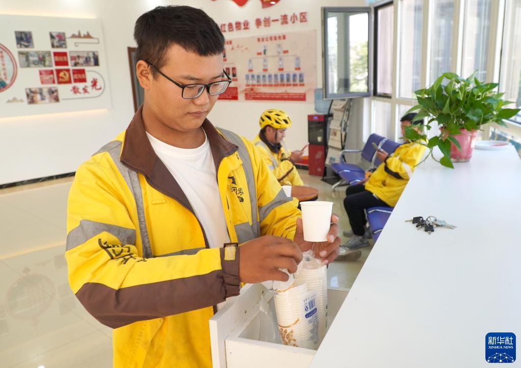 8月31日,在單縣園藝街道紫玉東郡小區“暖新驛站”,一名外賣(mài)配送員在取用一次性水杯。