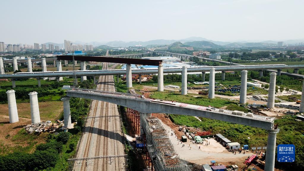 8月31日,由中鐵十局承建的濟鄭高鐵(山東段)跨京滬鐵路轉體橋成功“轉身”(無(wú)人機照片)。