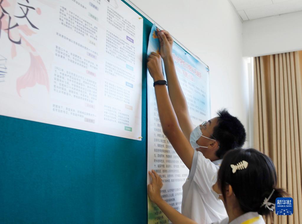 8月31日,在北京二中,高二年級學(xué)生在教室布置班級文化墻。