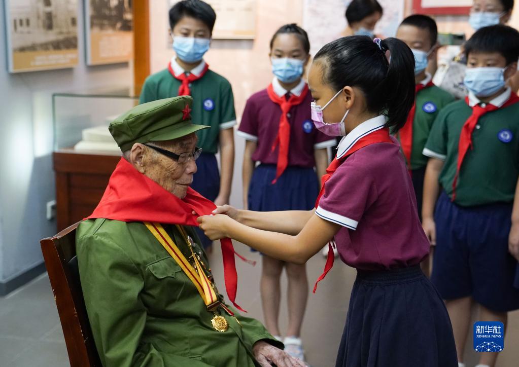 9月1日,江西省南昌市鐵路第一學(xué)校教育集團書(shū)院校區的學(xué)生在開(kāi)學(xué)第一天參觀(guān)南昌市新四軍軍部舊址陳列館。這是學(xué)生為新四軍老戰士系紅領(lǐng)巾。
