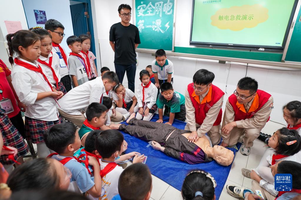 9月1日,江蘇省揚州市寶應縣供電公司的志愿者為寶應縣安宜實(shí)驗學(xué)校的學(xué)生講解觸電急救知識。