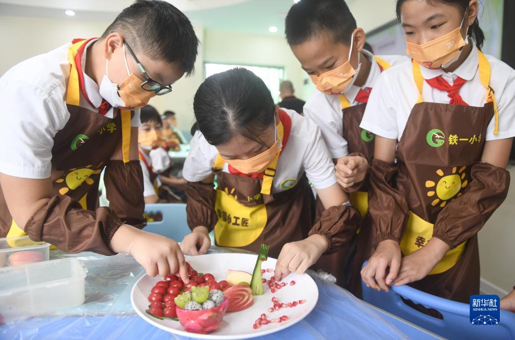 9月1日,廣州市鐵一小學(xué)的學(xué)生在勞動(dòng)課上制作水果拼盤(pán)。
