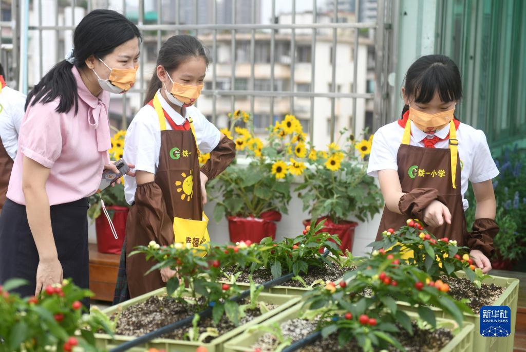 9月1日,廣州市鐵一小學(xué)的老師在勞動(dòng)課上給學(xué)生們講解辣椒的特性。