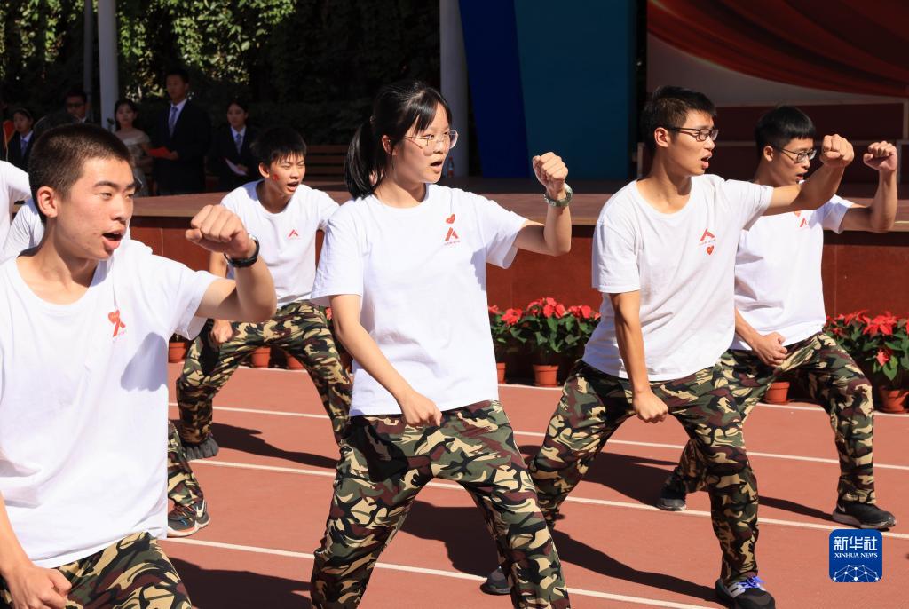 9月1日,中國人民大學(xué)附屬中學(xué)分校的學(xué)生在開(kāi)學(xué)典禮上表演軍體拳。