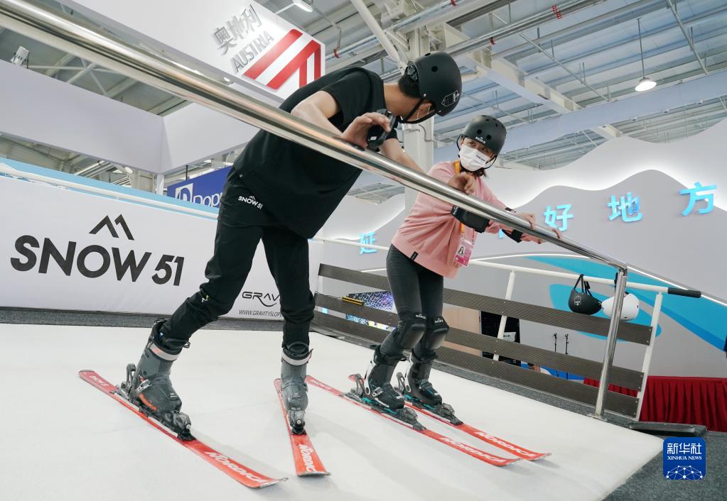9月1日,參會(huì )的媒體記者(右)在服貿會(huì )體育服務(wù)展館內體驗一款滑雪模擬設備。新華社記者 張晨霖 攝
