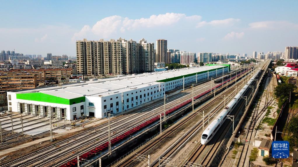 9月1日,一列高鐵駛過(guò)濟(南)鄭(州)高鐵濟南站動(dòng)客車(chē)整備所(無(wú)人機照片)。新華社記者 郭緒雷 攝