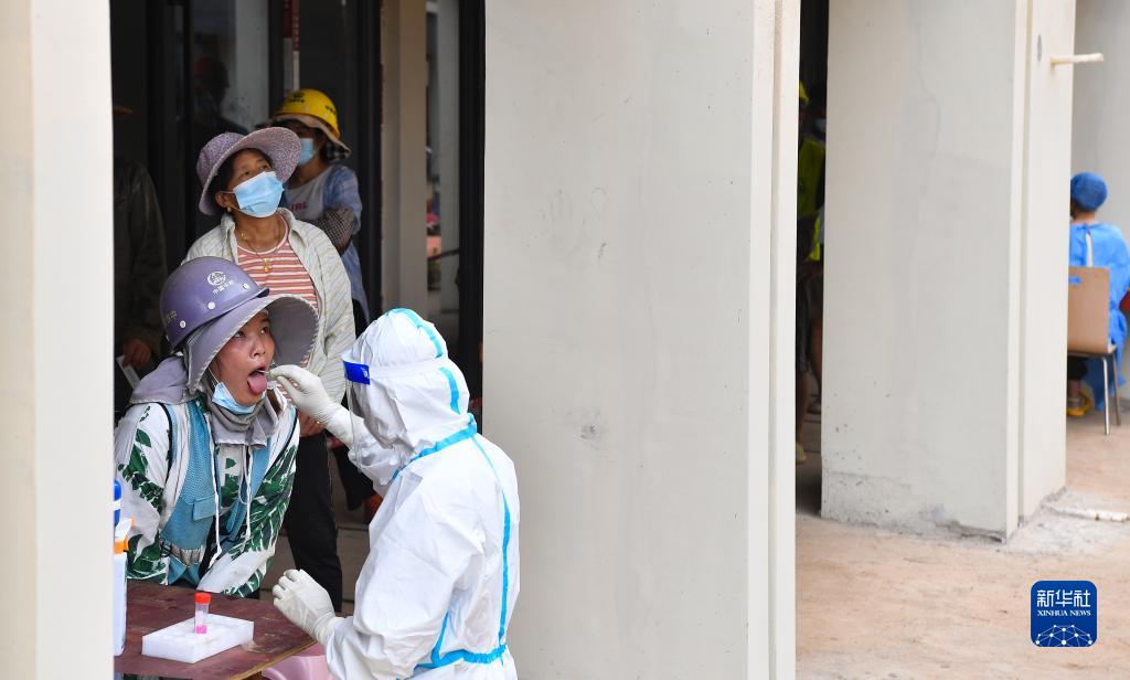 9月2日,在??诮瓥|新區東寨新居一期項目,工人排隊進(jìn)行核酸采樣。
