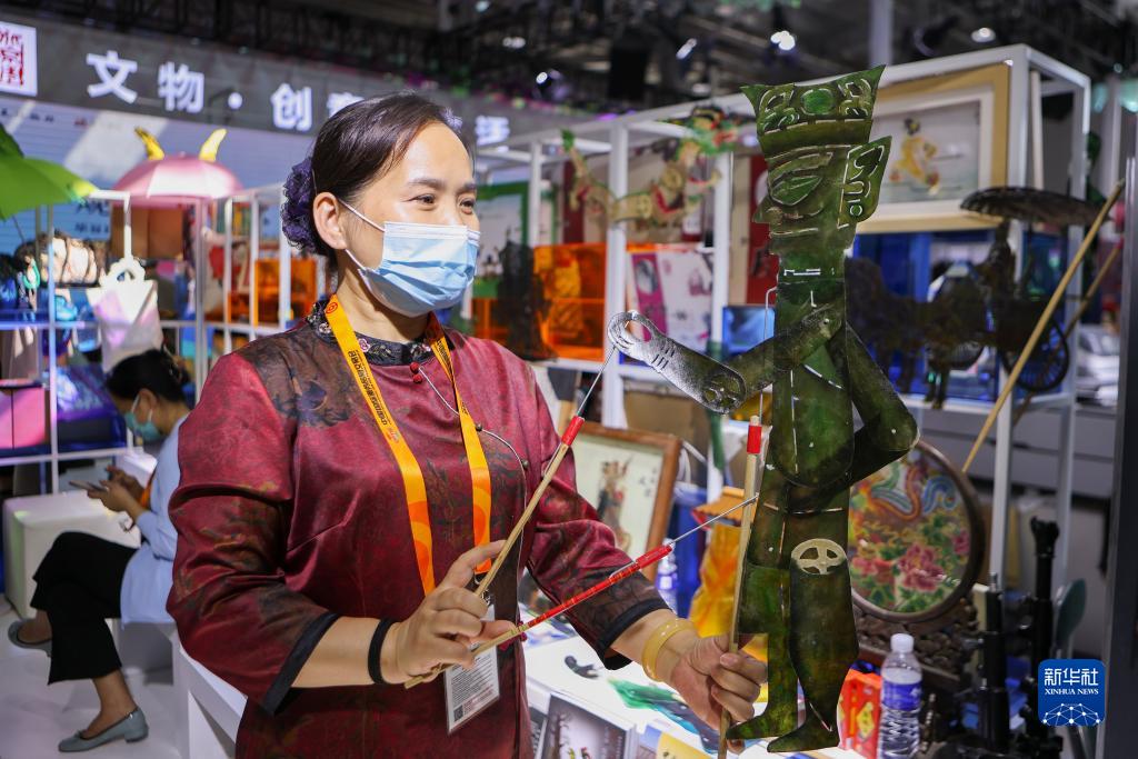 9月2日,在服貿會(huì )文旅服務(wù)專(zhuān)題展區,參展人員在展示皮影。2022年中國國際服務(wù)貿易交易會(huì )于8月31日至9月5日在位于北京的國家會(huì )議中心和首鋼園區舉辦。會(huì )上展示了眾多富有中國元素的特色展品,吸引了觀(guān)眾的目光。新華社記者 郝昭 攝