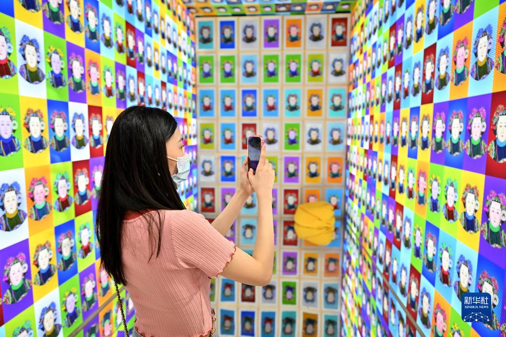 9月2日,一名參觀(guān)者在北京市海外文化交流中心展臺內拍攝以《同光十三絕》中梅巧玲形象為基礎,經(jīng)過(guò)數字技術(shù)再創(chuàng )作呈現的沉浸式數字藝術(shù)空間。新華社記者 李鑫 攝