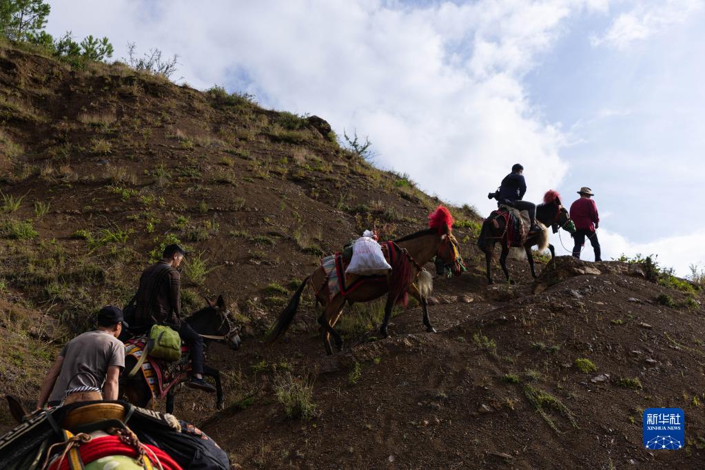 瀘沽湖馬幫帶著(zhù)游客前往牛窩子山山頂(9月1日攝)。
