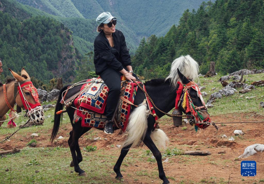 游客騎著(zhù)瀘沽湖馬幫隊的騾子上山(9月2日攝)。