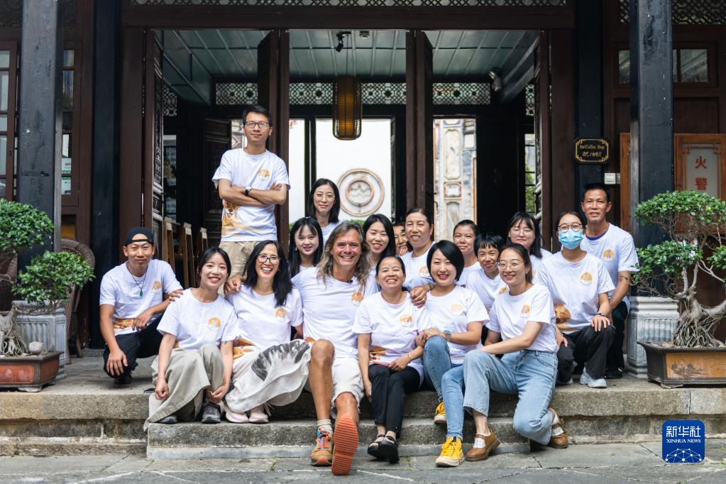 8月28日,林登和妻子瑾妮與喜林苑團隊在云南省喜洲古鎮喜林苑合影。