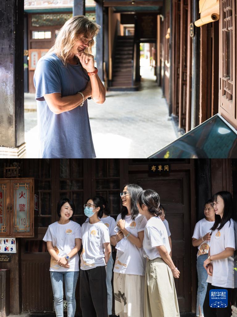 拼版照片:上圖為8月28日,林登在喜洲古鎮喜林苑觀(guān)看團隊錄制的生日祝福視頻;下圖為8月28日,林登的妻子瑾妮和喜林苑團隊準備為他慶祝60歲生日。