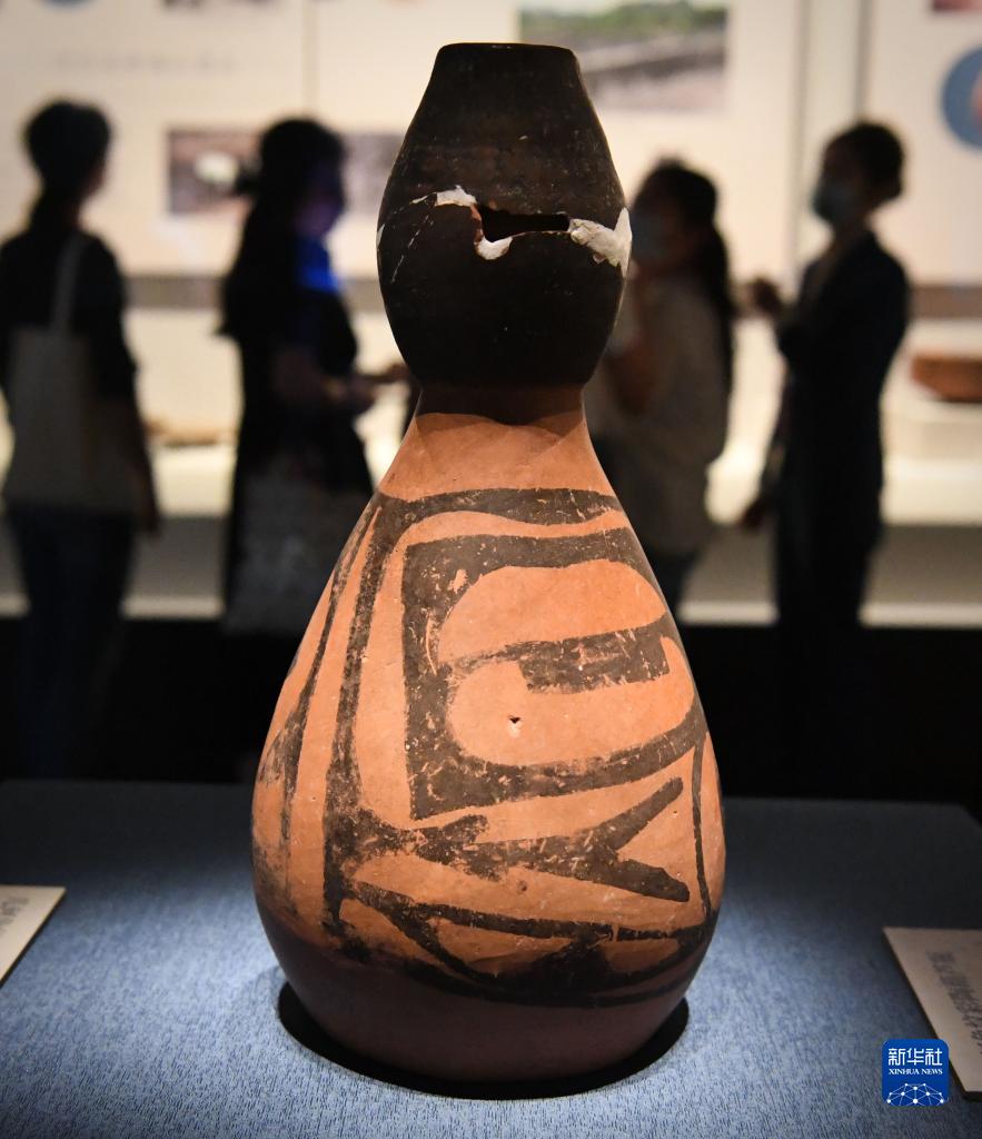 這是9月4日在“繁星盈天——中國百年百大考古發(fā)現展”上拍攝的“幾何魚(yú)紋彩陶葫蘆瓶”。