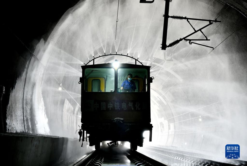 9月5日,在濟萊高鐵章丘段,隧道清洗車(chē)在清洗隧道壁。