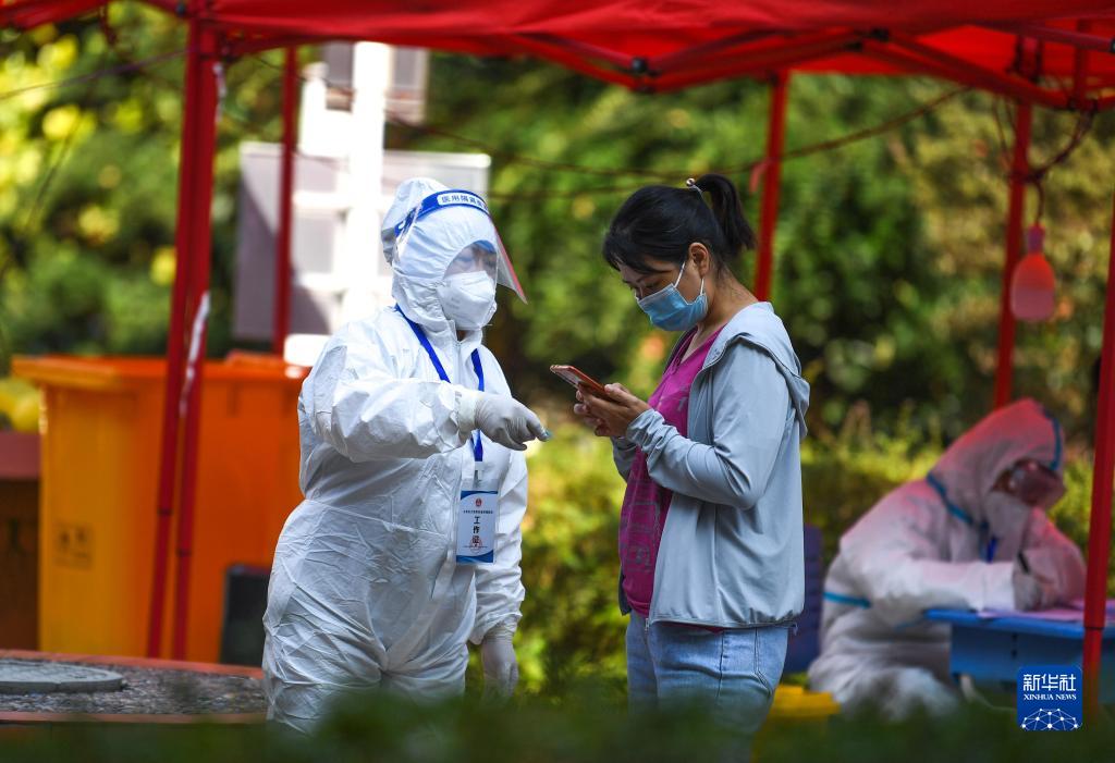 9月5日,醫護人員在貴陽(yáng)市云巖區大營(yíng)路街道中天花園社區指導市民做核酸檢測信息核對。