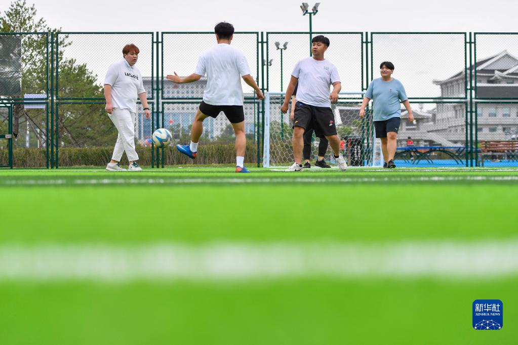 在延邊朝鮮族自治州延吉市阿里郎足球公園,市民在球場(chǎng)踢球(9月4日攝)。