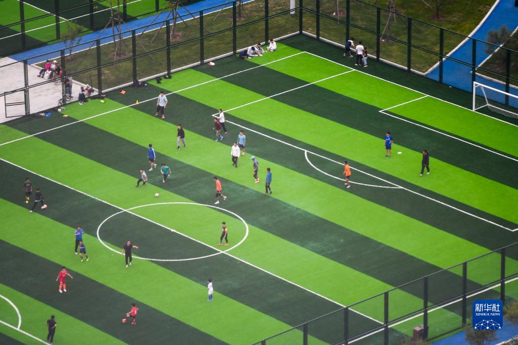 在延邊朝鮮族自治州延吉市阿里郎足球公園,市民在球場(chǎng)踢球(9月4日攝)。