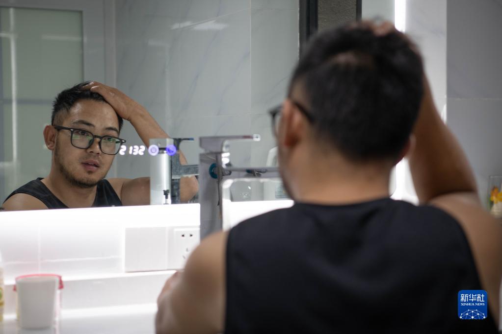 8月27日,何鵬在家中整理發(fā)型。