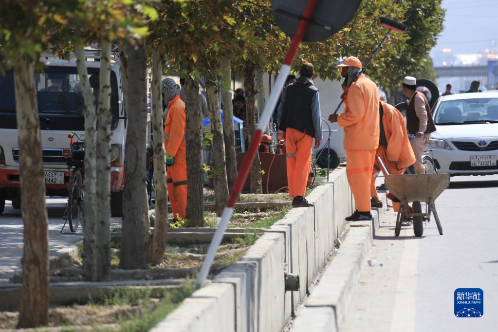 9月5日,阿富汗市政工人在喀布爾爆炸現場(chǎng)附近工作。