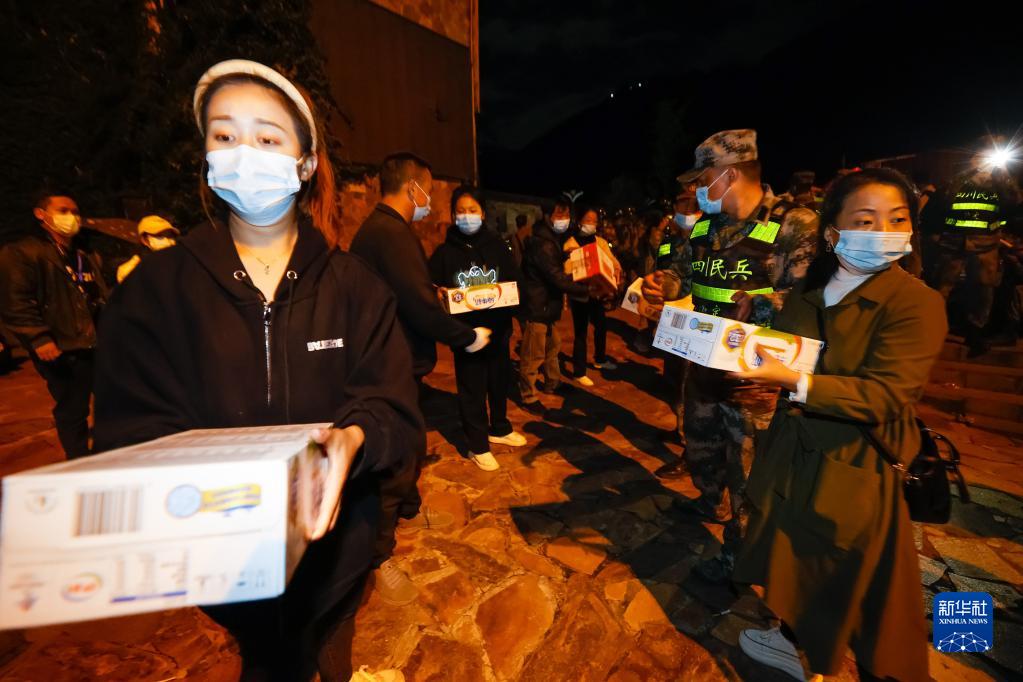 9月5日晚,在四川甘孜州瀘定縣磨西鎮的受災群眾臨時(shí)安置點(diǎn),人們在傳遞救災物資。