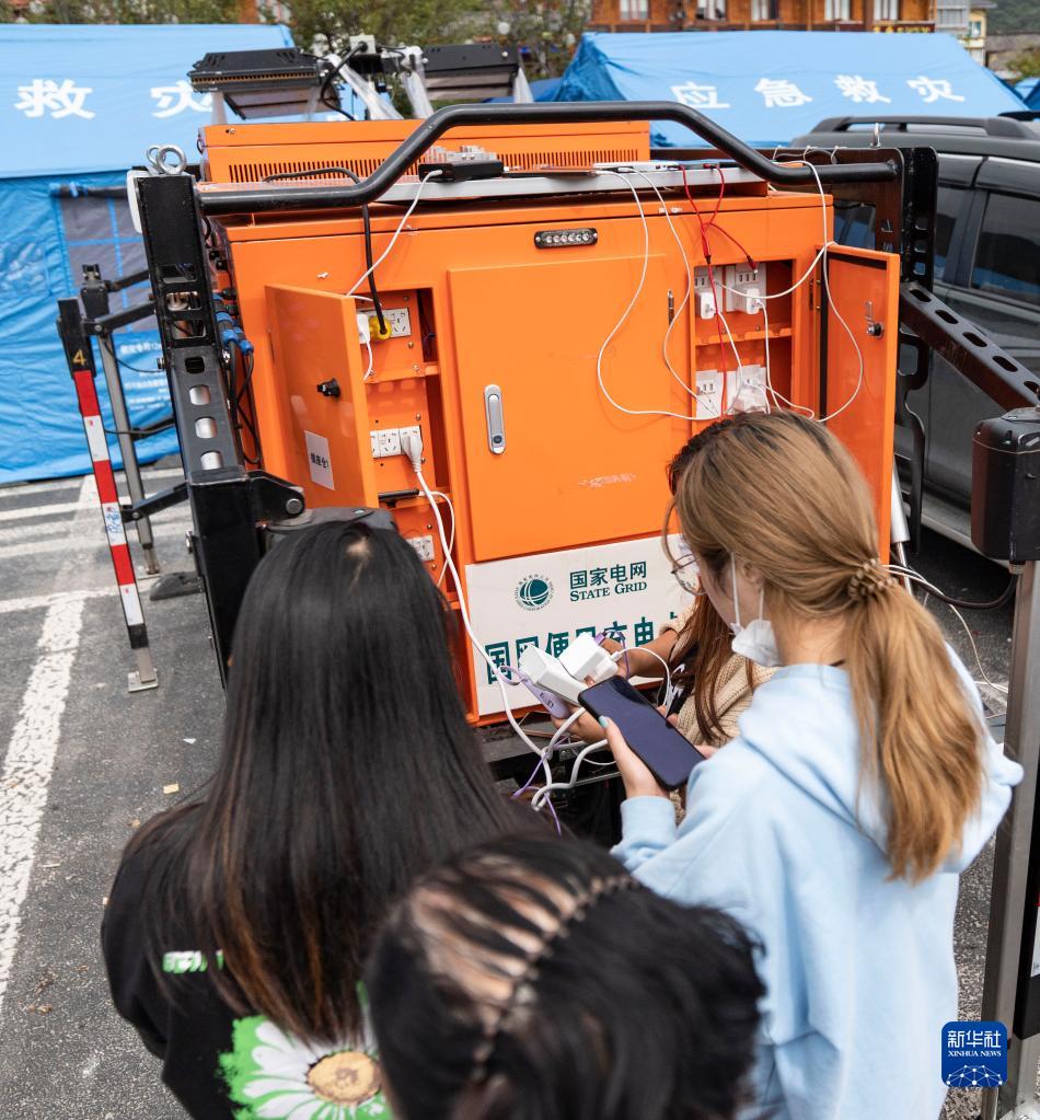 9月6日,在四川甘孜州瀘定縣磨西鎮海螺溝廣場(chǎng)受災群眾臨時(shí)安置點(diǎn),人們在國網(wǎng)便民充電點(diǎn)為手機充電。