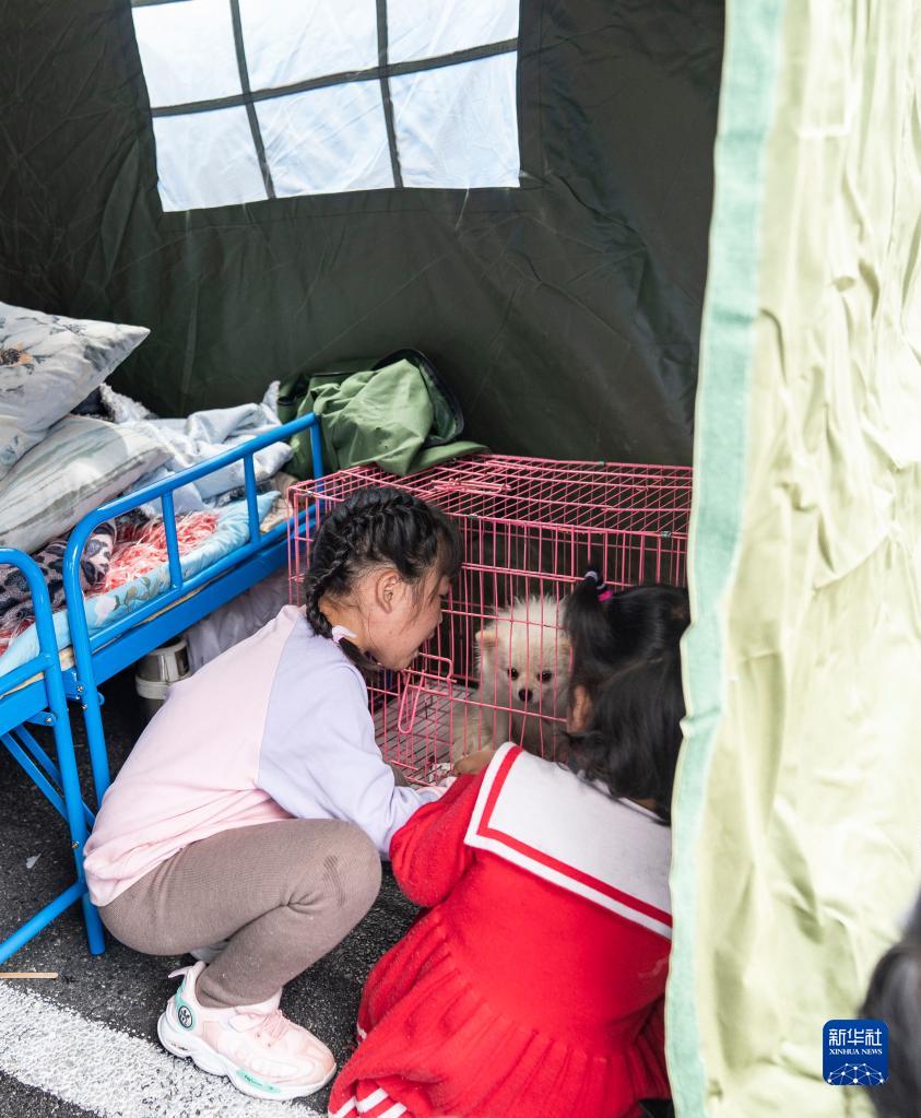 9月6日,在四川甘孜州瀘定縣磨西鎮海螺溝廣場(chǎng)受災群眾臨時(shí)安置點(diǎn),兒童與從家中帶過(guò)來(lái)的小狗玩耍。