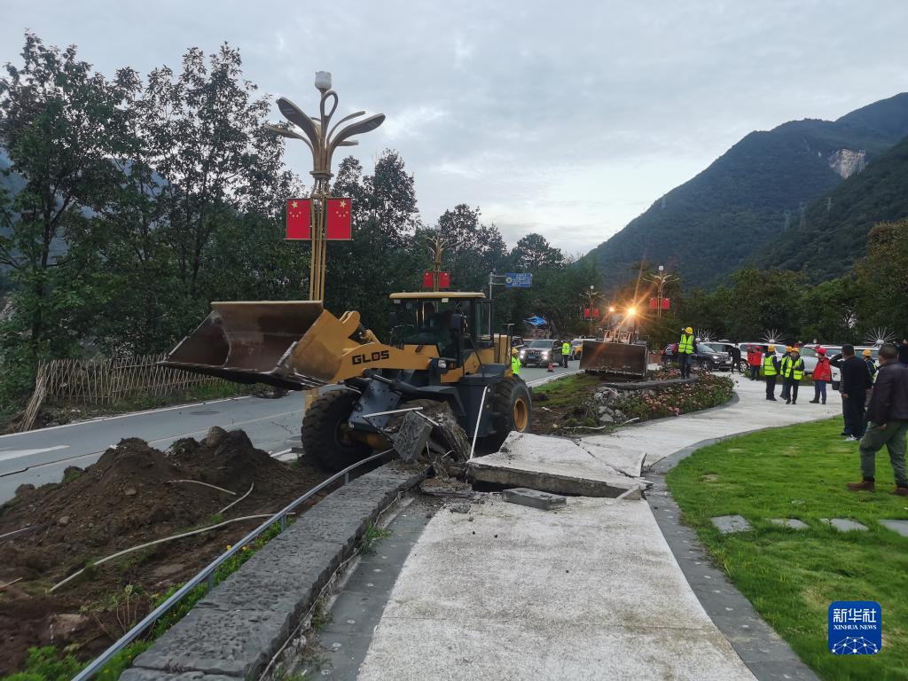 9月6日上午,在省道S434線(xiàn)磨西鎮至金光村受阻點(diǎn),工程機械在搶通便道。