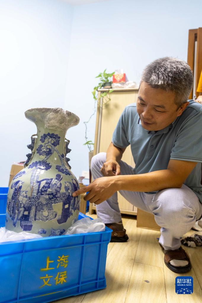 8月23日,上海市文物保護研究中心副主任翟楊介紹長(cháng)江口二號古船出水文物——清同治景德鎮窯豆青地堆白青花松下高士圖雙耳瓶。
