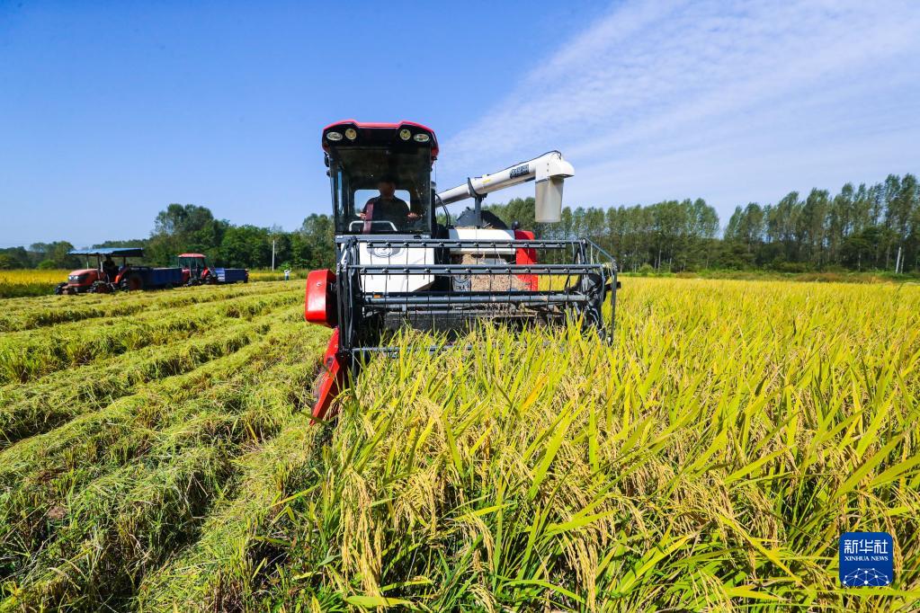 9月6日,河南省信陽(yáng)市光山縣羅陳鄉張樓村青龍河合作社社員在收水稻。