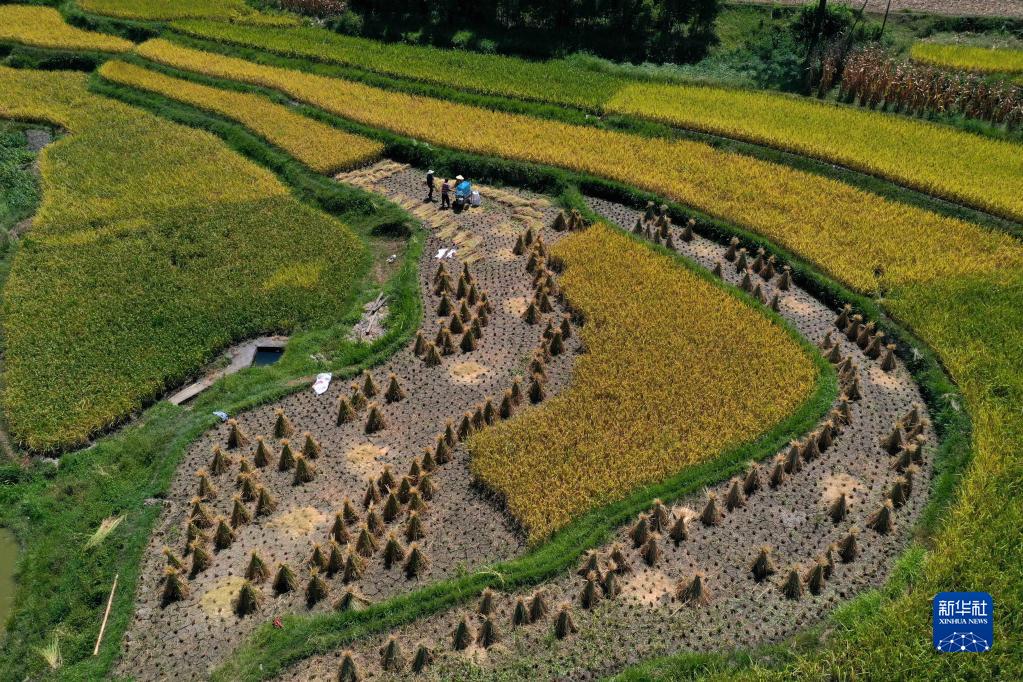 9月6日,村民在貴州省黔東南苗族侗族自治州丹寨縣興仁鎮興仁村收割水稻(無(wú)人機照片)。